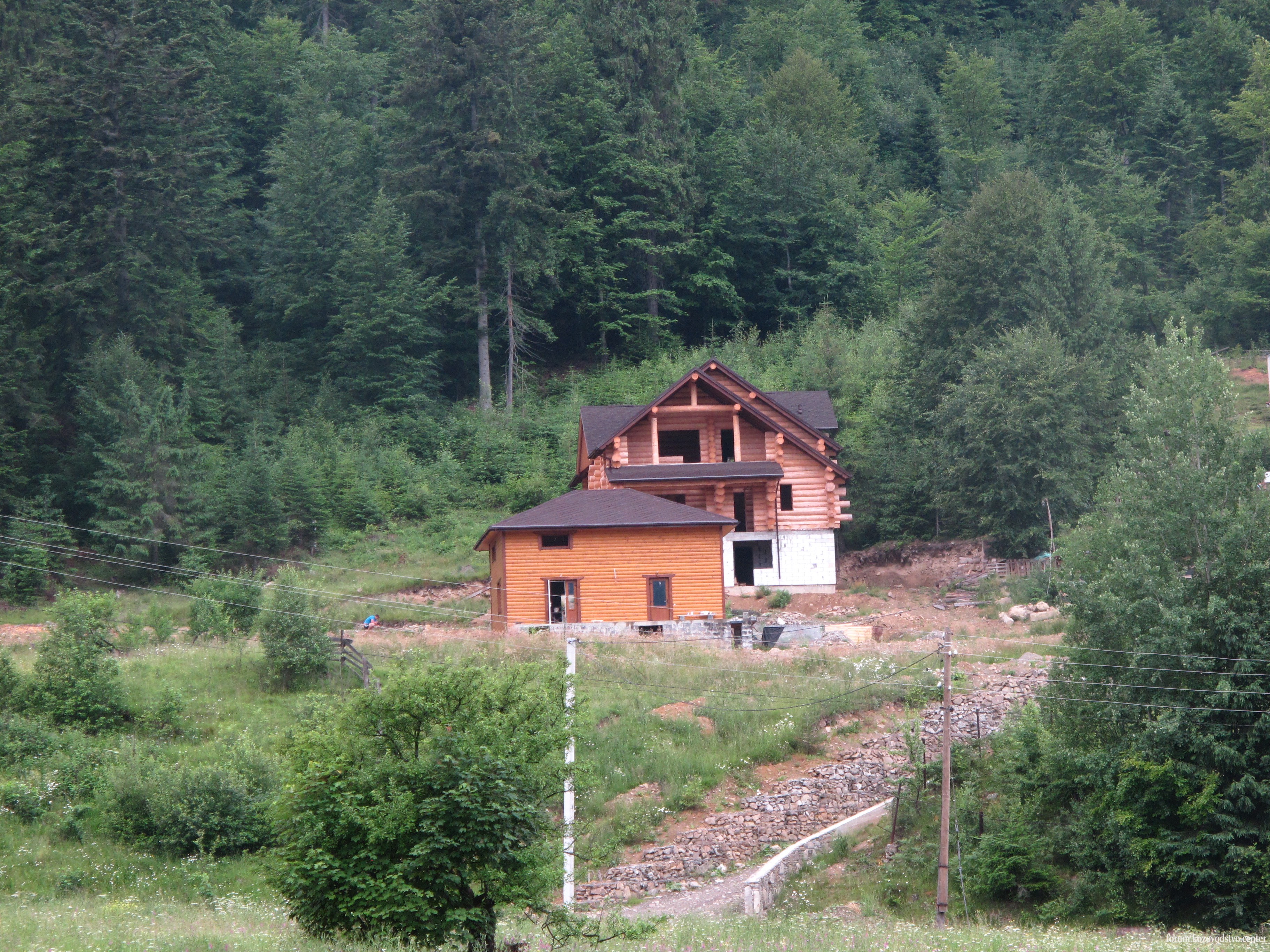 Вот наш участок снизу и наши 2 домишка. Сруб - наша мечта. А ниже деревянный коттедж для туристов, в нем я пока и живу.