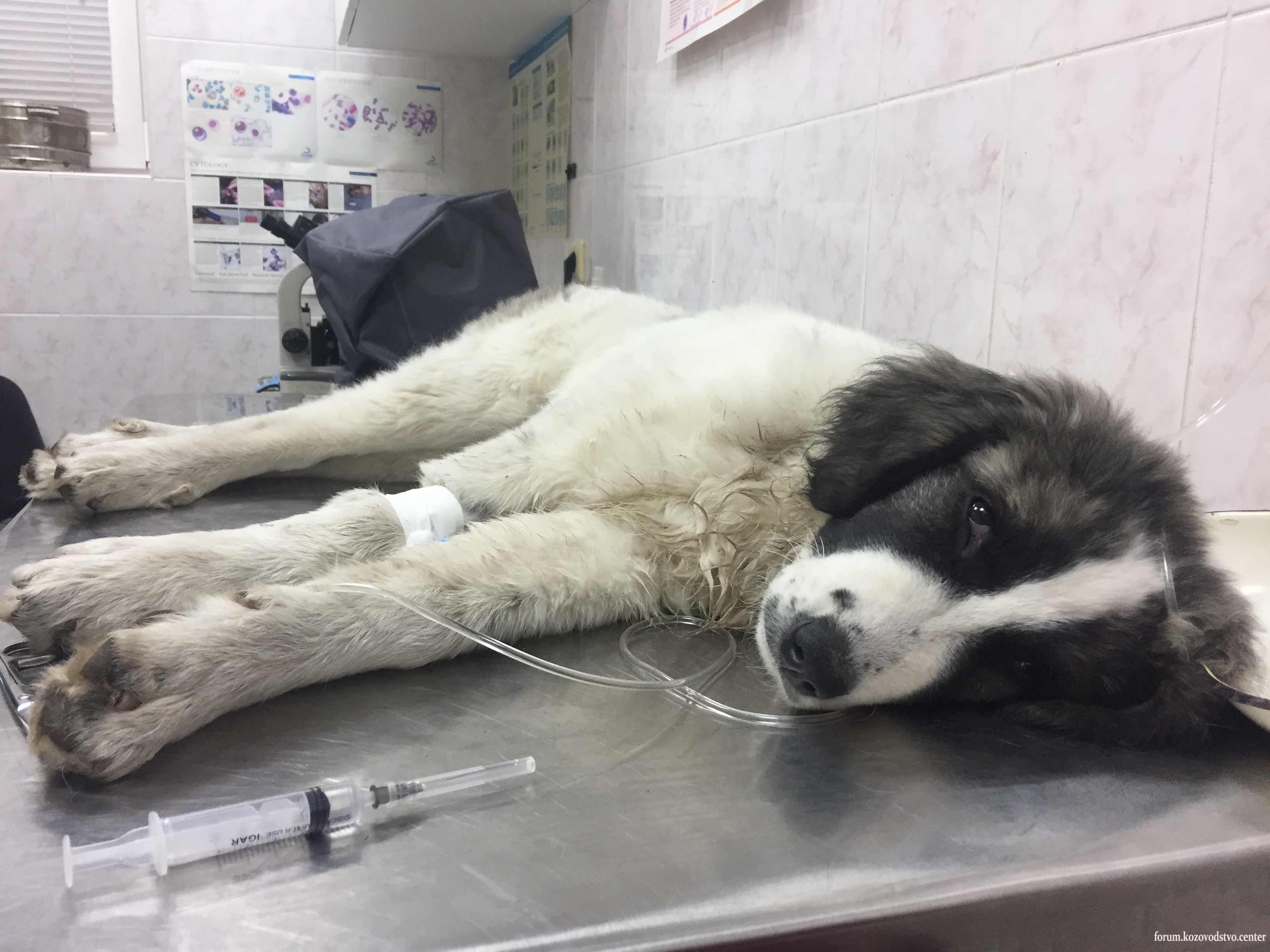 От вируса лечения не существует, вирус живет своей жизнью и если собака выживет, то на 5-7 день вырабатывает иммунитет и идет на выздоровление. У собаки кровавый понос с частичками эпителия кишечника и рвота. Наша задача не позволить прицепиться инфекциям, грибкам и т.д. на ослабленный организм и боремся с обезвоживанием. Я 5 суток практически жила с Бриной под капельницей.